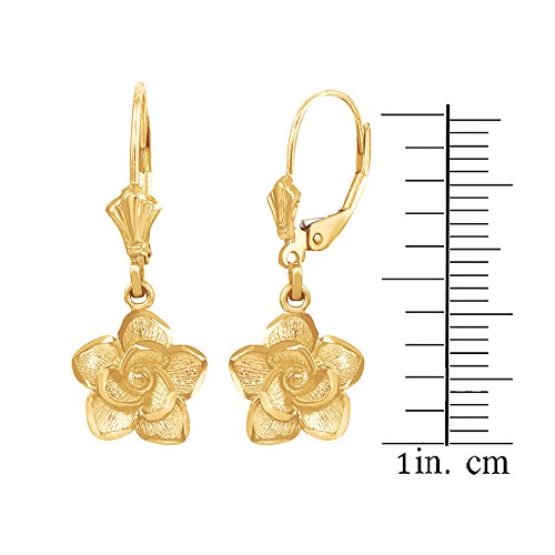 Treat yourself or a loved one to these elegant rose flower dangle earrings made with fine 14k yellow gold measuring 1.03 inch high including hook and 0.38 inch wide. Polished to perfection, these beautiful rose flower earrings are the perfect adornment for the savvy jewelry aficionado.