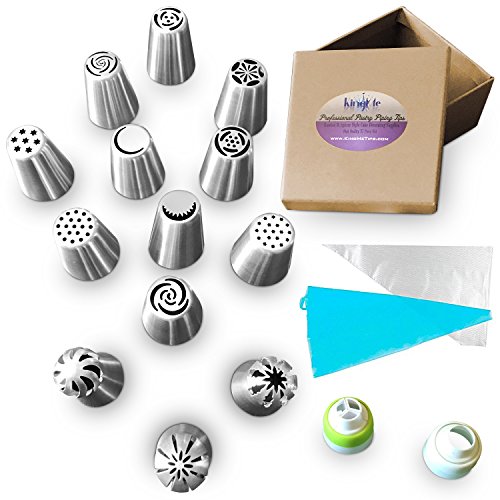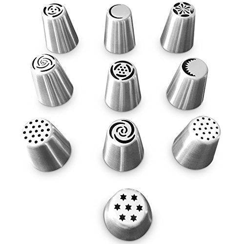 INCLUDES RUSSIAN & SPHERE TIPS – Professional Pastry Piping Tips 37 Piece Set – This is more than your basic cake decorating set -- Top 10 Russian Piping Tips – 3 Sphere Ball Tips – 2 Reusable Silicone Pastry Bags – 20 Disposable Cake Decorating Bags – 1 Single Tip Coupler Icing Nozzle – 1 Triple Tip CouplerPiece Set – Top 10 Russian Piping Tips – 3 Sphere Ball Tips – 2 Reusable Silicone Pastry Bags – 20 Disposable Cake Decorating Bags – 1 Single Tip Coupler Icing Nozzle – 1 Triple Tip Coupler