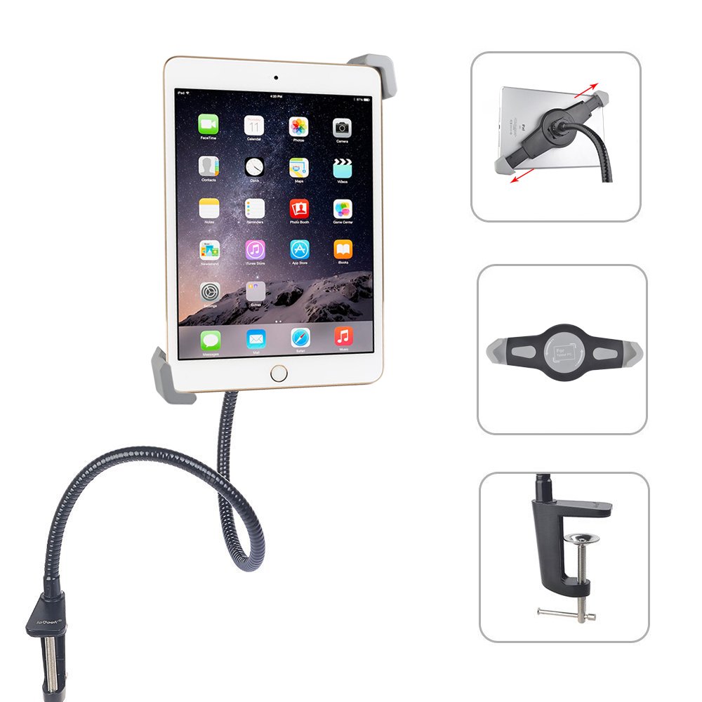 The ipad stand is a clamp type which can be rotated 360 degrees by a Goose Neck / Flexible Arm design which can move up, down, left and right and can firmly fix the iPad tablet PC in a free position of the desk.