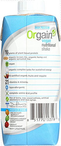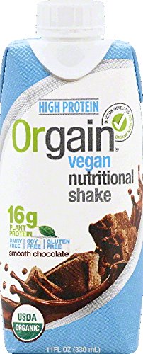 Orgain Organic Vegan Smooth Chocolate Nutrition Shakes are a naturally delicious and dairy free on-the-go snack. Each serving contains 16g of organic, plant-based protein, 21 vitamins and minerals and 10 fruits and vegetables. USDA Organic, Gluten Free, Vegetarian, Non-GMO, Soy Free. No artificial flavors, colors or preservatives.