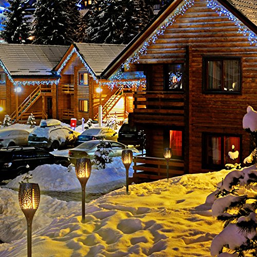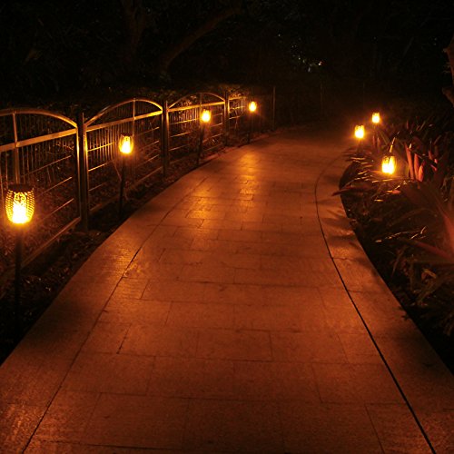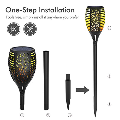 - Solar Powered Light: Battery change and cable free. During daytime the solar panel absorbs the sunlight and converts solar energy into electricity. The solar torch light turns on automatically at dusk