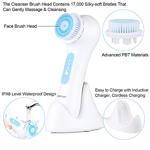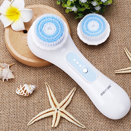 - ✔Waterproof Sonic Facial Brushes Cleansing System: Advanced portable exfoliator cleanser and face scrubber, IPX 6 waterproof facial cleansing brush kit, P2017 advanced facial cleansing brush and massager with 2 brush heads for removing blackhead, exfoliating and massaging, comes with inductive cordless charger, 3 attachments, 2 replacement brush heads. Kingdomcares zero damage facial brush takes advanced PBT materials, much gentler and softer, no skin irritating.