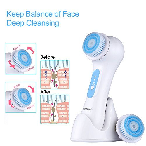 - ✔Leaving Face Fresh, Clean, Clear and Vibrant Looking: 3 speeds rotating facial cleansing brush delivers daily deep cleansing and gentle exfoliation to renew softer, smoother and more radiant youthful skin looking. Exfoliating dead, dried and flaky skin, it promotes cellular turnover, collagen production, reducing fine lines and wrinkles, recovering skin elasticity and vitality. Massage away fine lines and wrinkles to brighten skin, smooth bumpy skin to refresh and renew healthy skin texture.