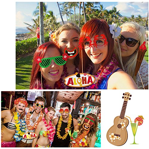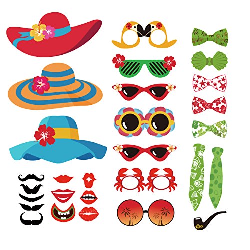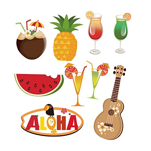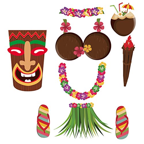 Pineapple*1 Summer cocktail *2 Lips* 6 Beard *5 Watermelon* 1 Tiki mask *1 Coconut bra*1 Hawaii Travel Cap* 3 Pipe *1 Cigars* 1 Glasses* 6 Head flower *1 Grass skirt *1 ALOHA logo *1 Wreath *1 Beach style slippers *1 pair Torch* 1 Margarita wine *2 Bow tie* 5 Coconut *1 Tie *2 Youkrili * 0