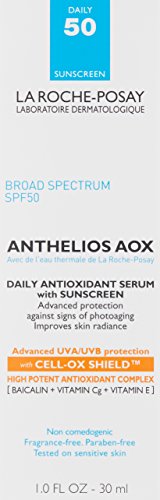 Anthelios AOX Face Sunscreen SPF 50 Daily Antioxidant Face Serum with Sunscreen with Cell-Ox Shield Broad Spectrum SPF 50 is a face sunscreen. This La Roche-Posay sunscreen’s features are: