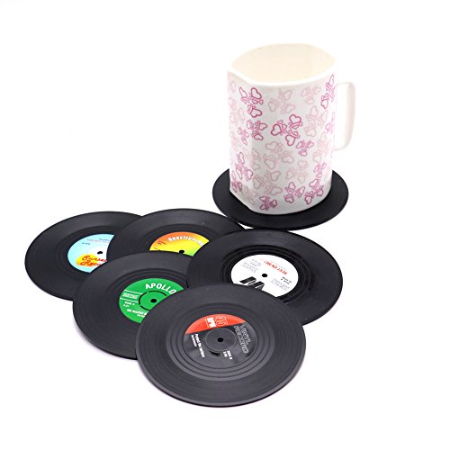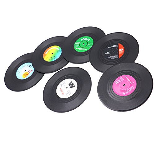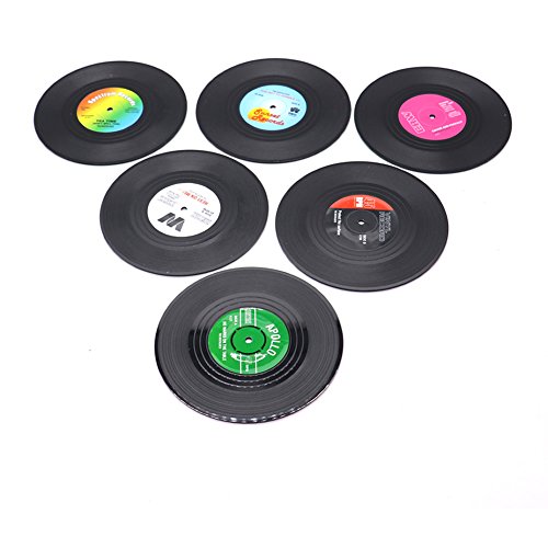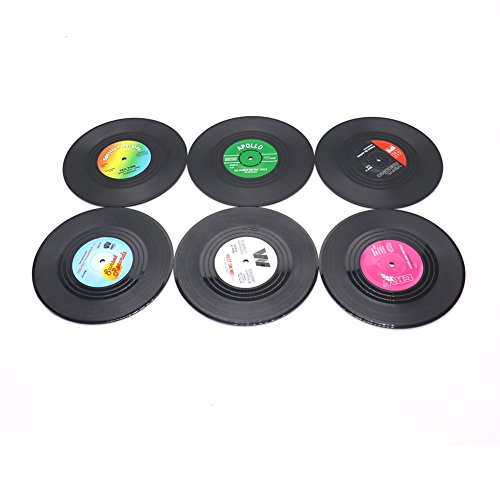 HUELE Set of 6 Colorful Vinyl Record Disk Coasters With Funny Labels - Perfect for Music Lovers