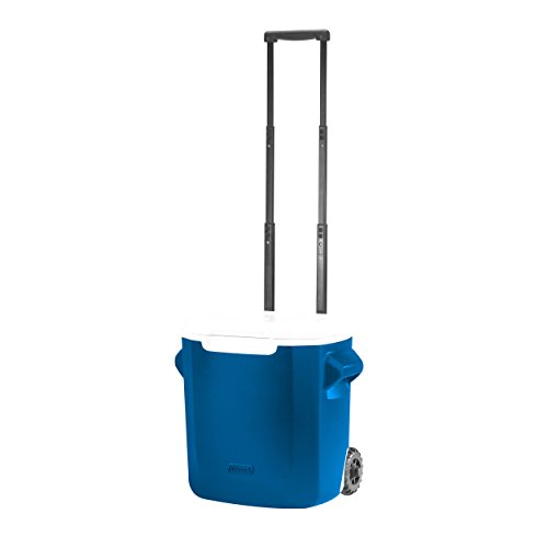 The Coleman 16-Quart Personal Wheeled Cooler can hold 22 twelve-ounce cans, and is tall enough to hold 2-liter bottles upright. The convenient handle extends for comfortable transporting, and retracts for easy storage; recessed wheels ensure that the cooler rolls smoothly and is easy to pull. Color: Blue.Feature