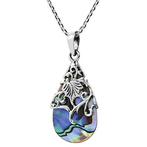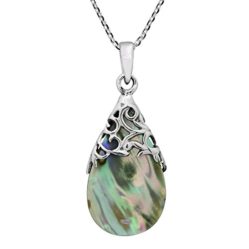 A floral vine inspired filigree of .925 sterling silver en-wraps a teardrop shaped abalone shell pendant in this lovely design hand crafted by Khun Goong from Thailand. This pendant is a perfect addition for a vintage yet classic style and can be worn with a range of outfits. The necklace set includes an 18 inches cable chain with round spring ring clasp. PLEASE NOTE: The handcrafted nature of this product will produce minor differences in design, sizing and weight. Variations will occur from piece to piece, measurements may vary slightly.AERAVIDA works directly with gifted and talented Artisans from all over the world. At the core of our philosophy is fair trade and fostering a sustainable future for our Artisans.