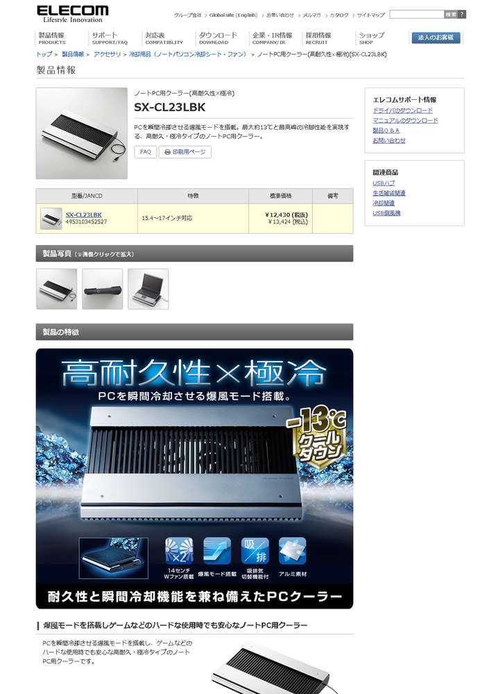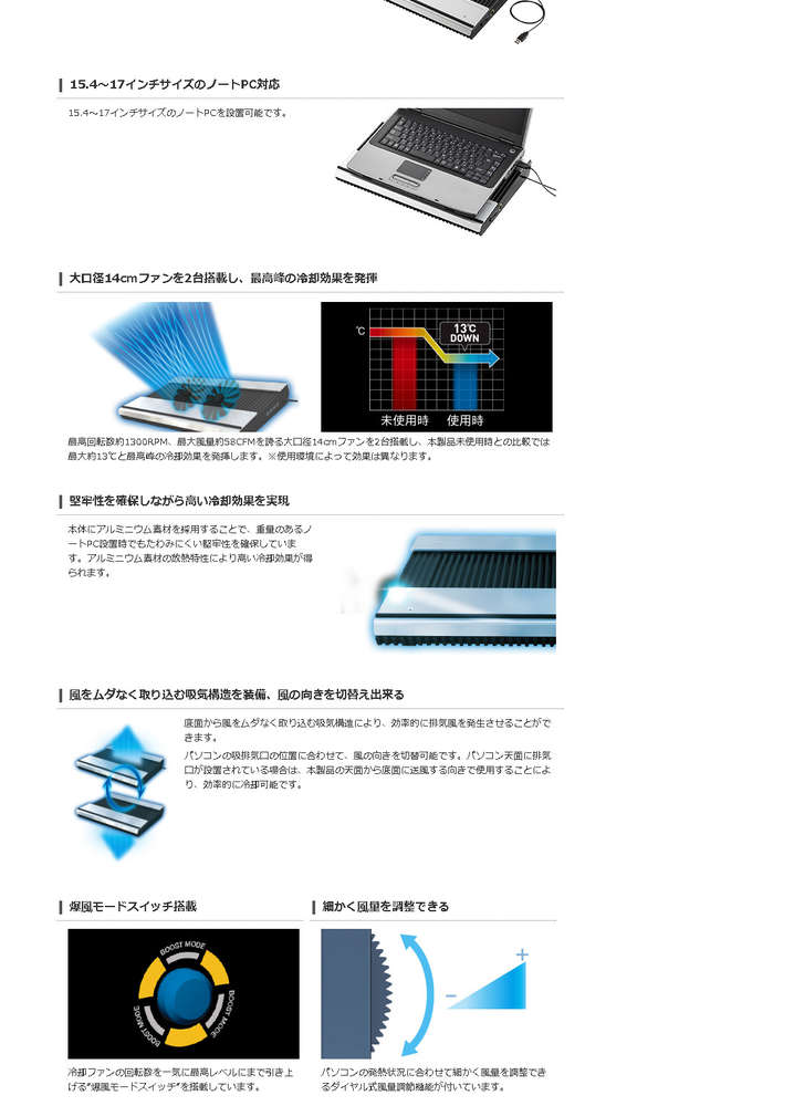 ●冷却台PCを瞬間冷却させる爆風モードを搭載。最大約13℃と最高峰の冷脚性能を実現する、高耐久・極冷タイプのノートPC用クーラー。