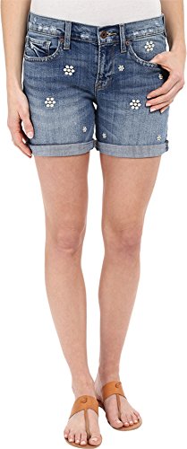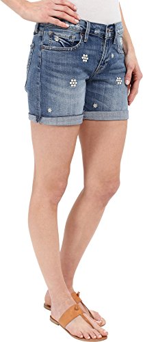Floral embroidery detail throughout. Mid-rise construction. Belt loop waistband. Zip fly and button closure. Classic five-pocket construction. Rolled cuffs. 99% cotton, 1% spandex. Machine wash cold, tumble dry low. Imported.
