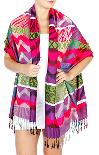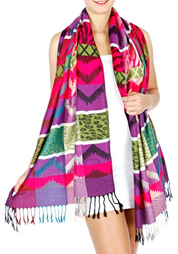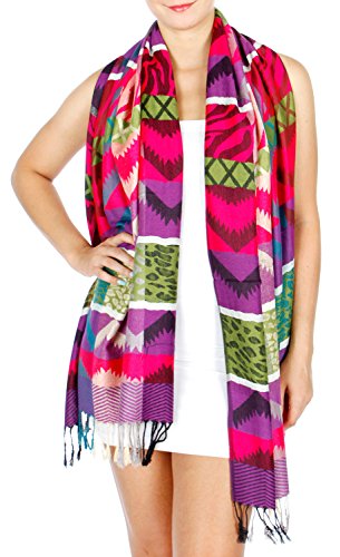 Product DescriptionThis pashmina features multi color tribal abstract and animal mixed pattern woven fabric, with fringes Label : 55% Pashmina 45% Silk Size 28 x...0