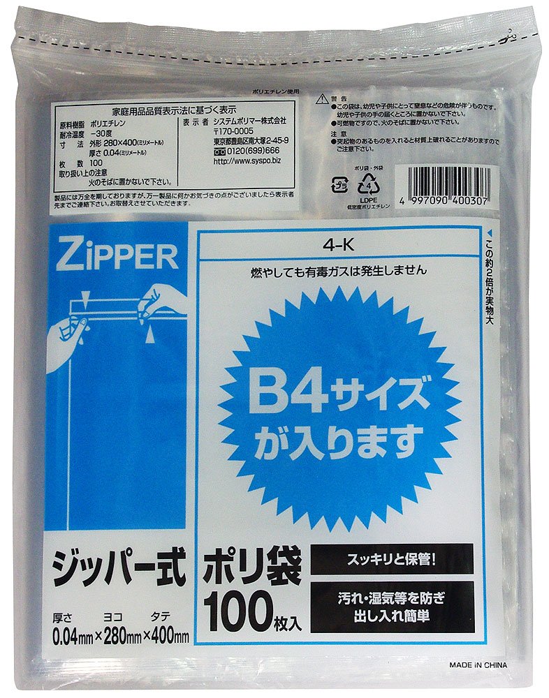 Zippered plastic bag transparent 100 pieces B4 size 4-K