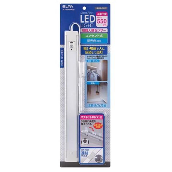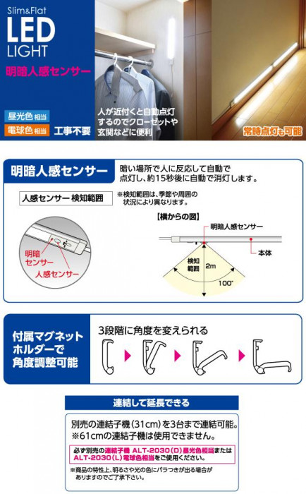 暗い場所で人に反応して自動で点灯し、約15秒後に自動で消灯します。常時点灯も可能で、クローゼットや玄関などに便利です。導光板使用でスリムなのにムラなくしっかり明るい!薄型スリムなので取り付けも簡単です。 |