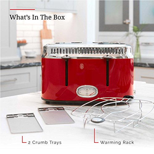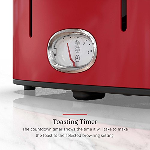 Classic retro-styling meets modern innovation for premium toasting performance. This 4-slice toaster features a countdown timer that shows precisely how much time remains on the toasting cycle. The variable browning control ranges from 1 (light) to 6 (dark) to satisfy all preferences. Choose the Bagel function for a perfectly toasted cut side with a warmed bottom side or the Frozen setting for fresh-like results. This toaster comes with a removable warming rack that quickly heats buns, pastries, and rolls. Plus, the removable crumb tray ensures easy cleanup.