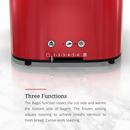 Three Functions - The Bagel function toasts the cut side and warms the bottom side of bagels. The Frozen setting adjusts toasting to achieve results identical to fresh bread. Cancel ends toasting.