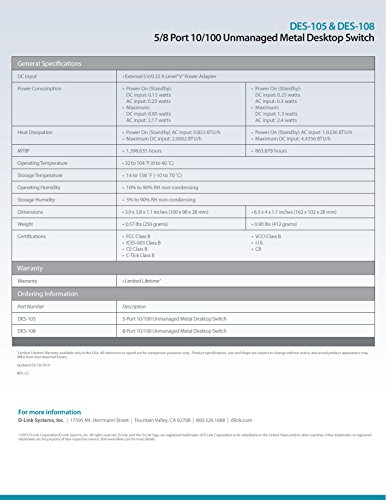 D-Link 5 Port 10/100 Unmanaged Metal Desktop Switch (DES-105)
