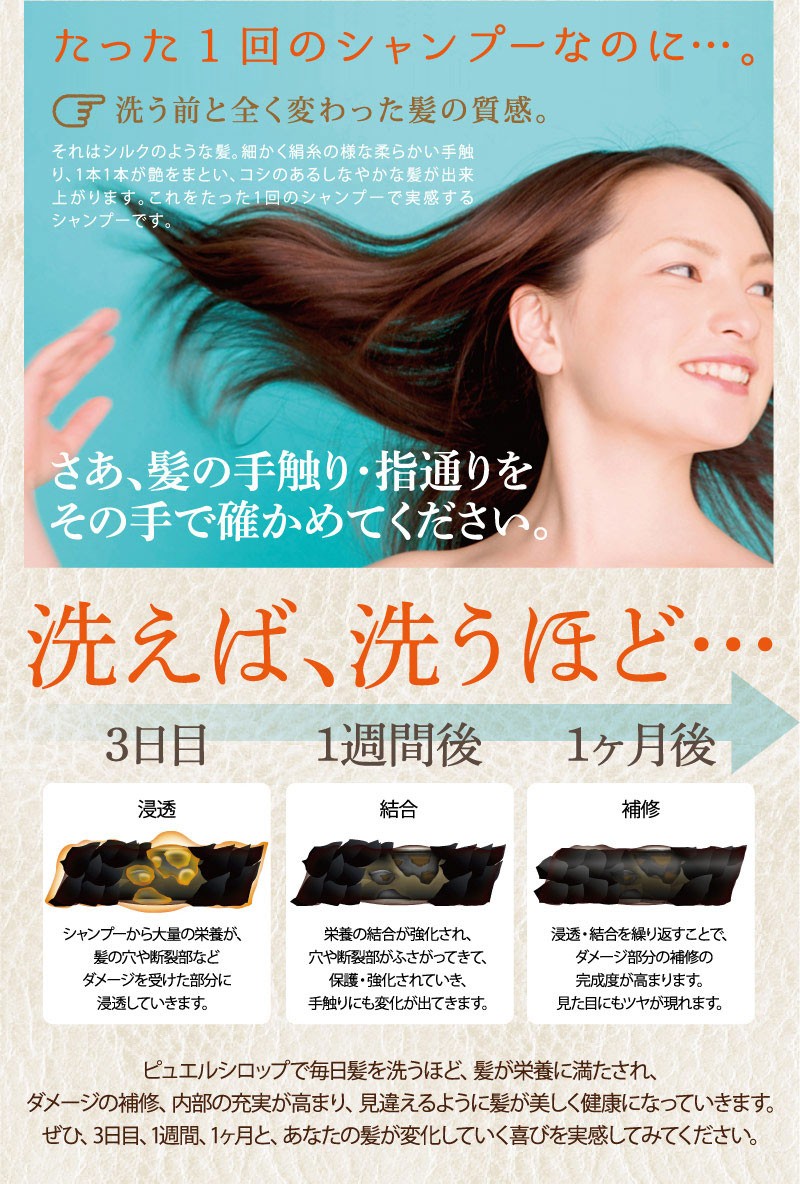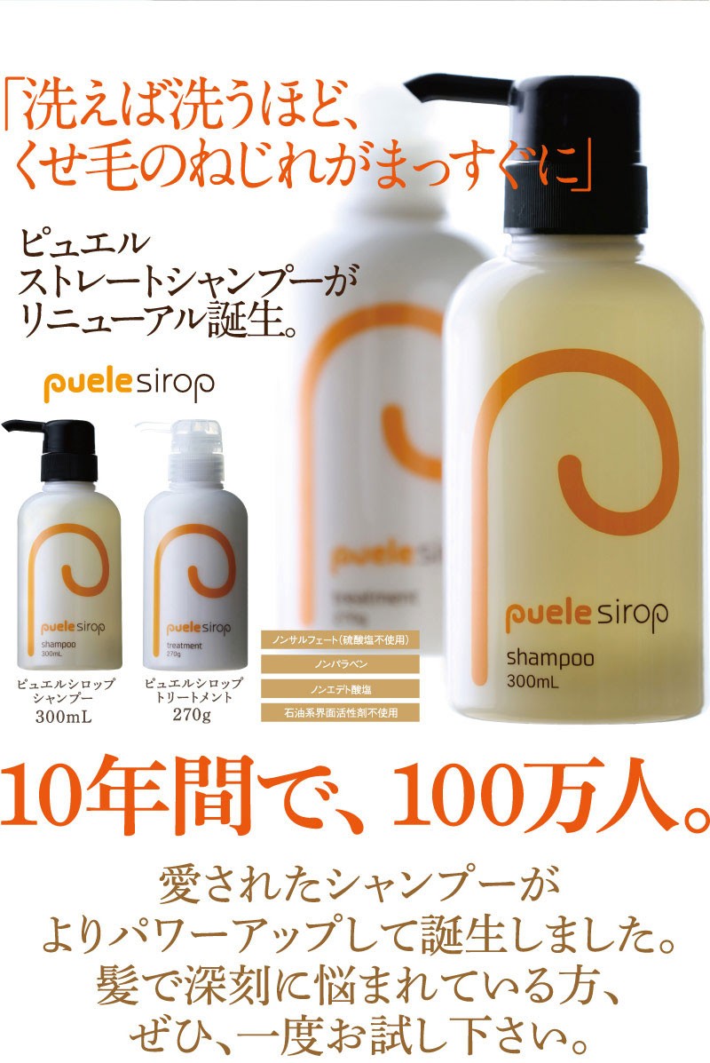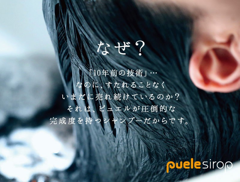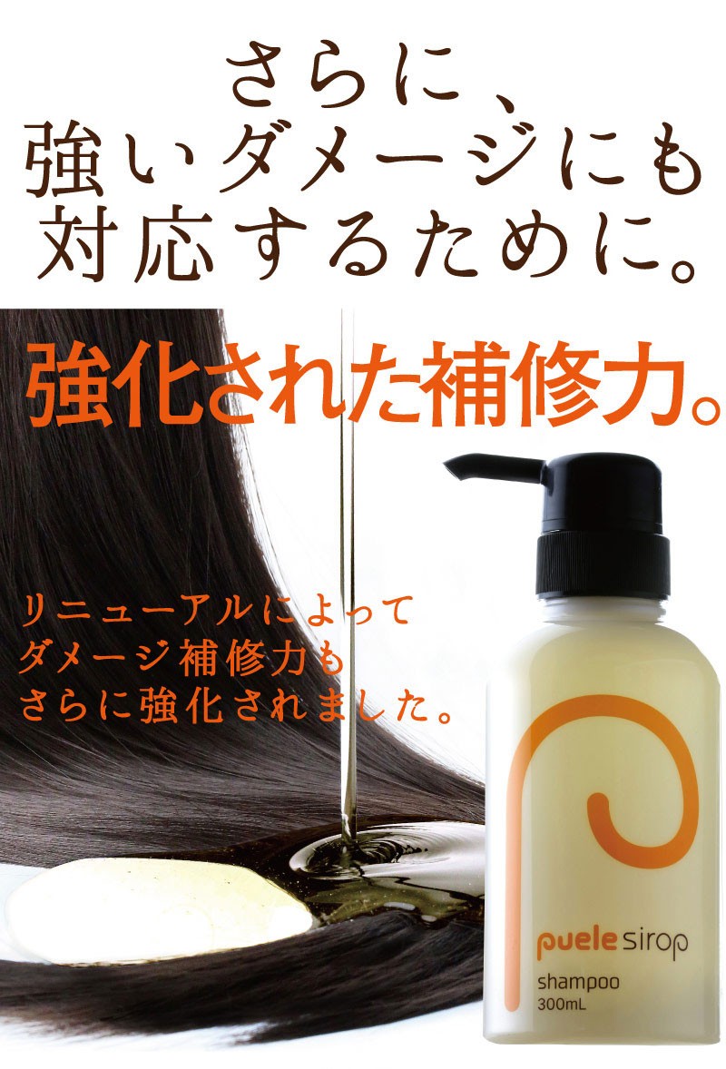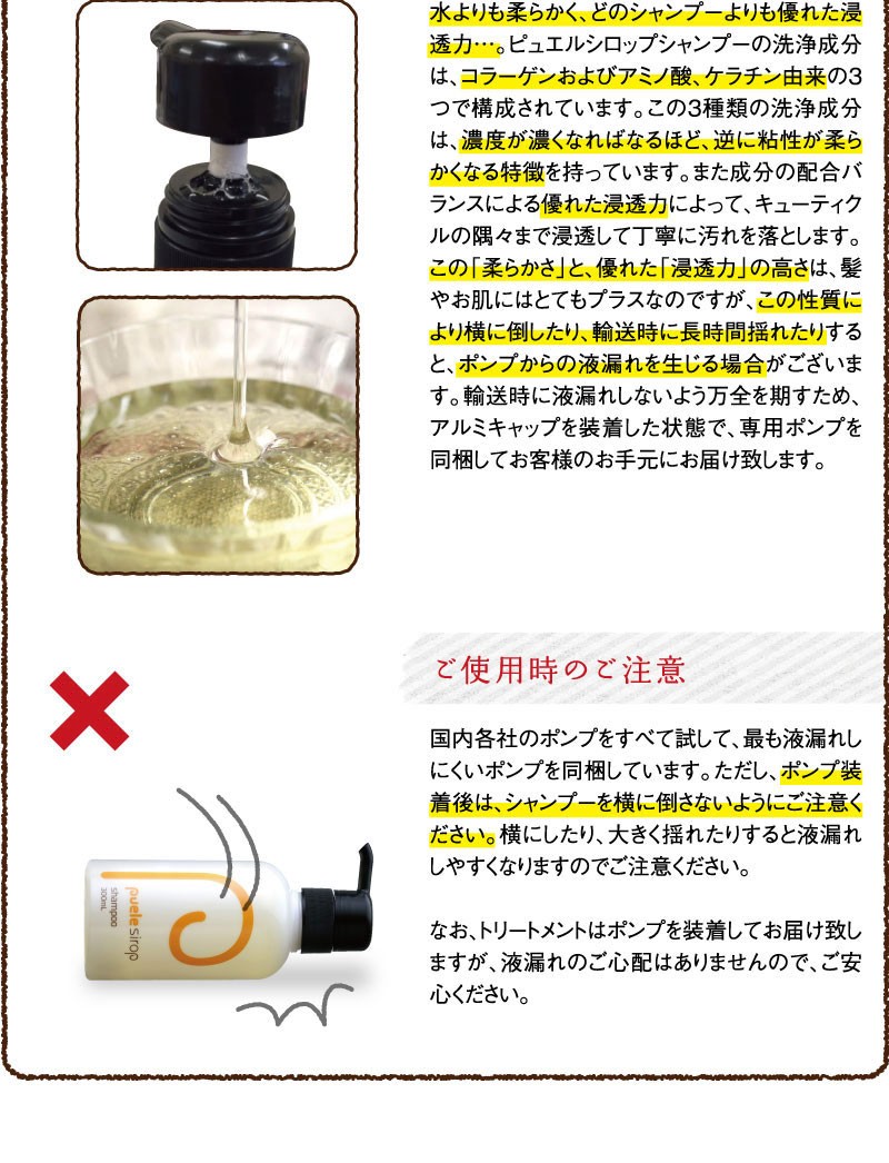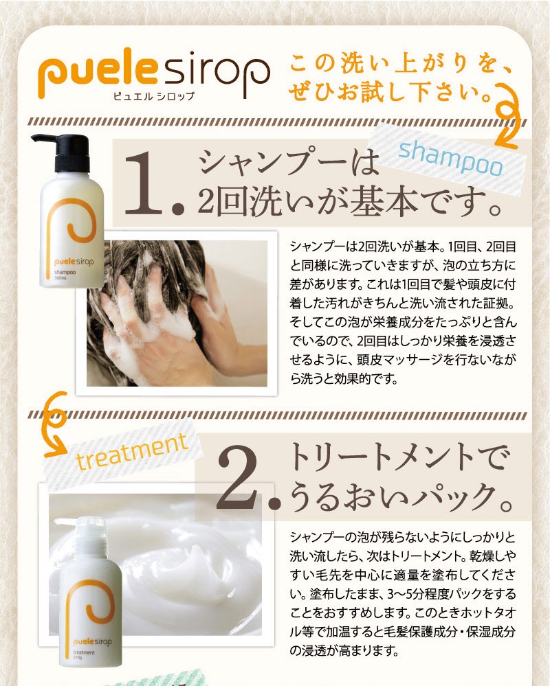 | ご使用方法 | よく濡らした髪に適量をつけて、充分に泡立てて洗い、よくすすいでください。同様にして二度洗いをおすすめします。 また、「ピュエルシロップトリートメント」と一緒にお使いいただくと、より一層効果が引き立ちます。 |