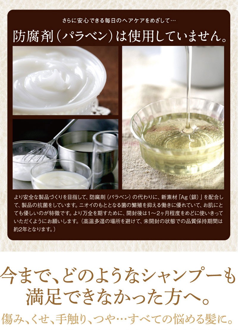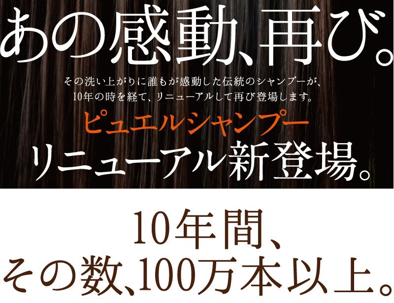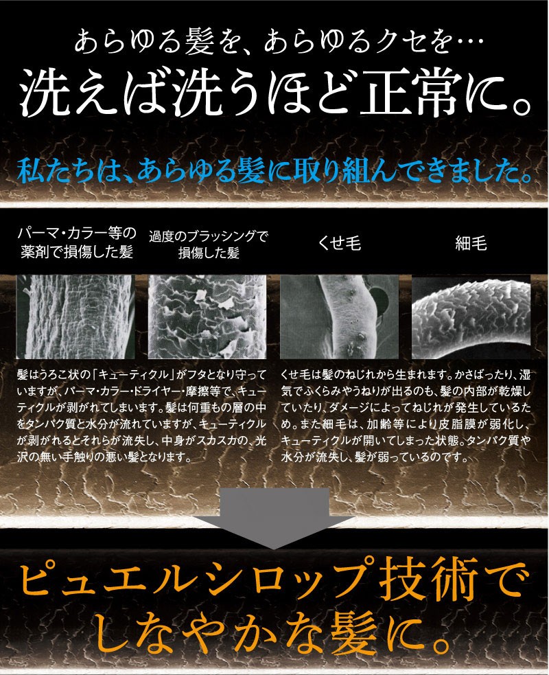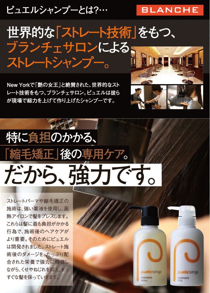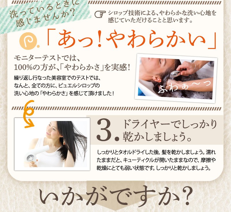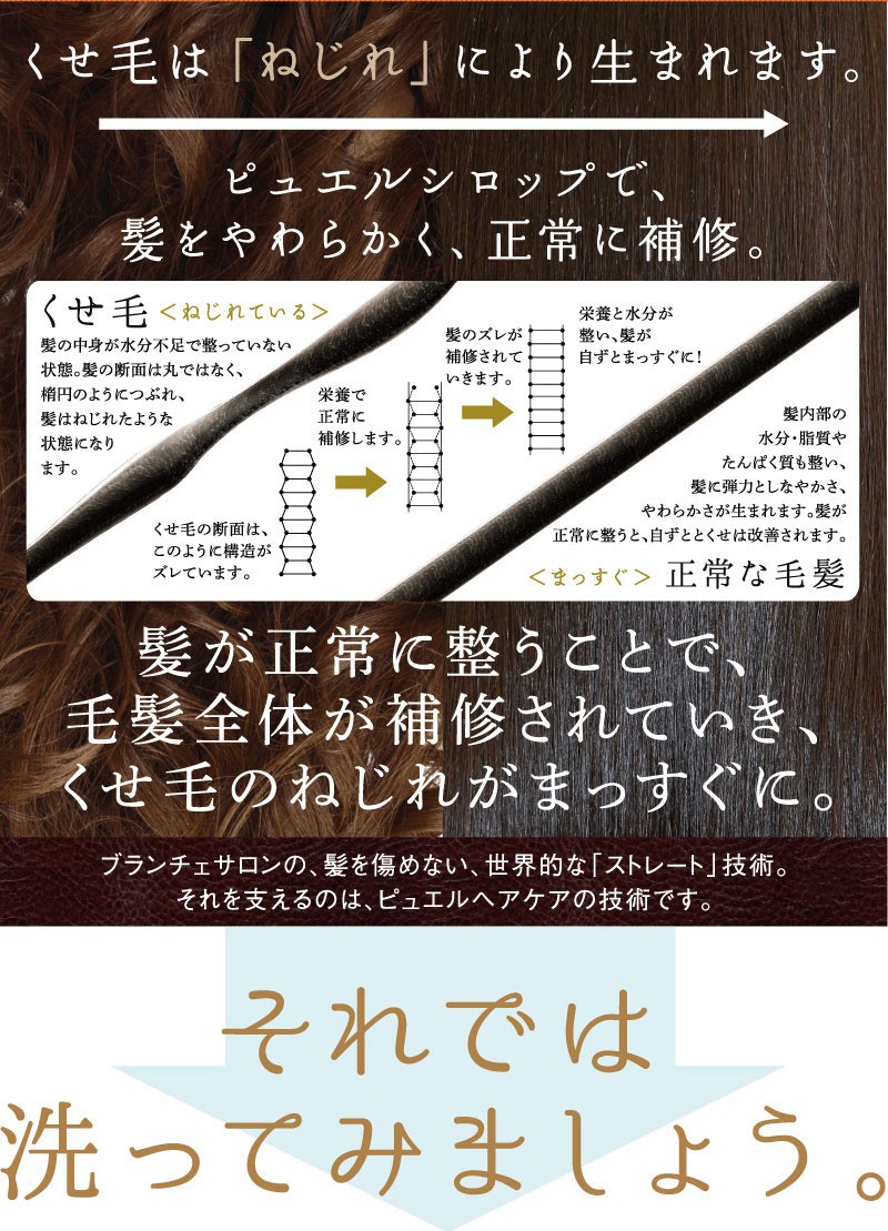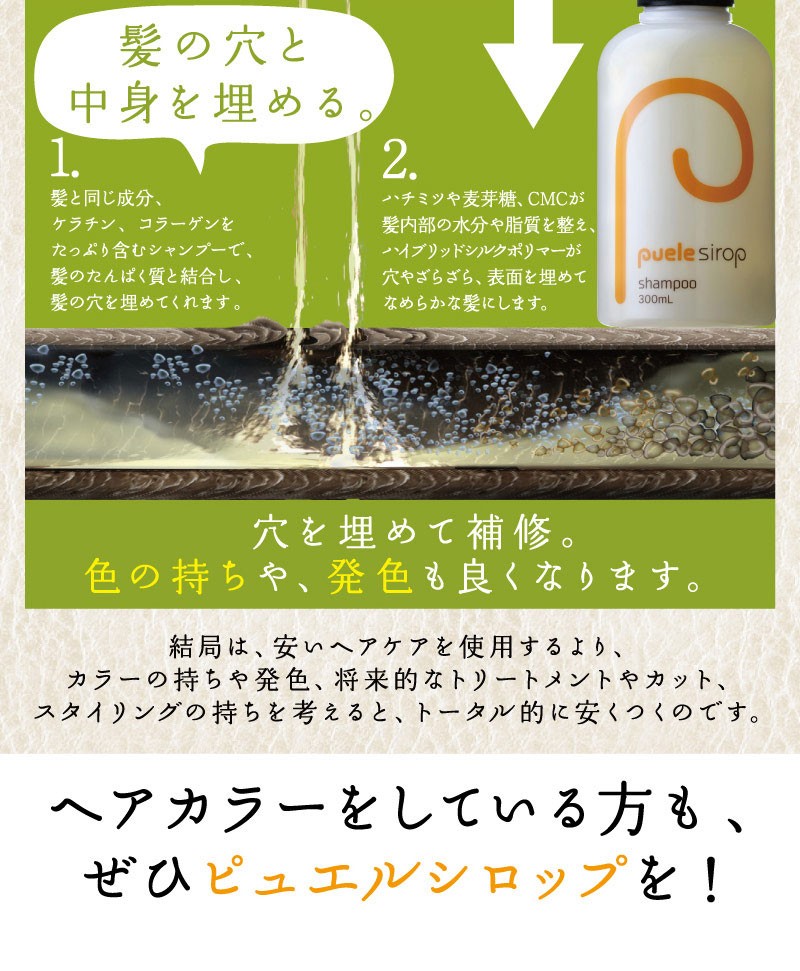 | ご使用方法 | よく濡らした髪に適量をつけて、充分に泡立てて洗い、よくすすいでください。同様にして二度洗いをおすすめします。 また、「ピュエルシロップトリートメント」と一緒にお使いいただくと、より一層効果が引き立ちます。 |