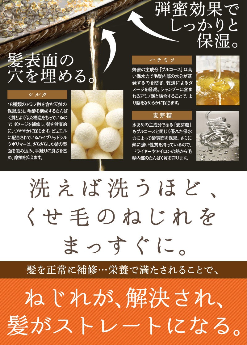| 成分 | 水、ハチミツ、ジメチコン、シクロメチコン、セタノール、グリセリン、水飴、ステアルトリモニウムクロリド、アミノプロピルジメチコン、グアーヒドロキシプロピルトリモニウムクロリド、(加水分解シルク/PG-プロピルメチルシランジオール)クロスポリマー、PCA-Na、アルギニン、アスパラギン酸、PCA、グリシン、アラニン、セリン、バリン、コメヌカスフィンゴ糖脂質、イソロイシン、トレオニン、プロリン、水添レシチン、ヒスチジン、フェニルアラニン、リゾレシチン、イソプロパノール、フィチン酸、乳酸Na、酸化銀、フェノキシエタノール、メチルイソチアゾリノン、メチルクロロイソチアゾリノン、香料 |