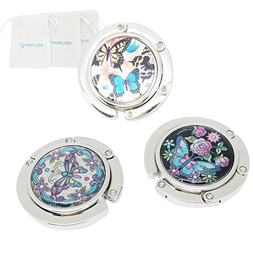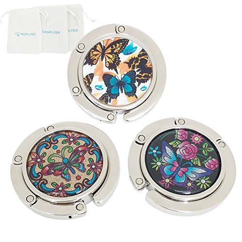 Product Description Never leave your purse on the dirty floor again by utilizing the ROFLYER Purse Hook, keeps your handbag safely,prevents your bag from falling off so you can eat in peace.This sleek stylish purse hook is great beautiful, very convenient to carry in your purse or pocket for everyday use, fit on most tables and bars.Each hook hanger has a anti-slip grip rubber backing to prevent slippage of almost any surface.the lightweight slim design won't add any extra and unnecessary bulk or weight to your bag.Used to hang your handbag from a table or bar when you are in Cafe, Restaurant, movie theatre, Bars, Lady's restroom and any others places.Compact cute adornments to match with your handbags, foldable, easy to pack and store. Best gift for all ladies and girls for birthdays, Christmas, and party favors! 0