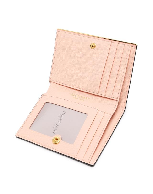 내부 베이비 핑크 배색으로 여성스럽고, 심플한 외관을 보여주며, 하단의 로고와 골드 바 장식으로 포인트를 준 2단 반지갑입니다.