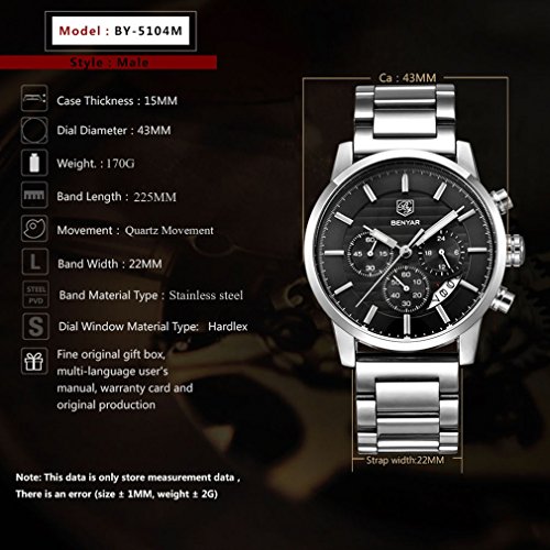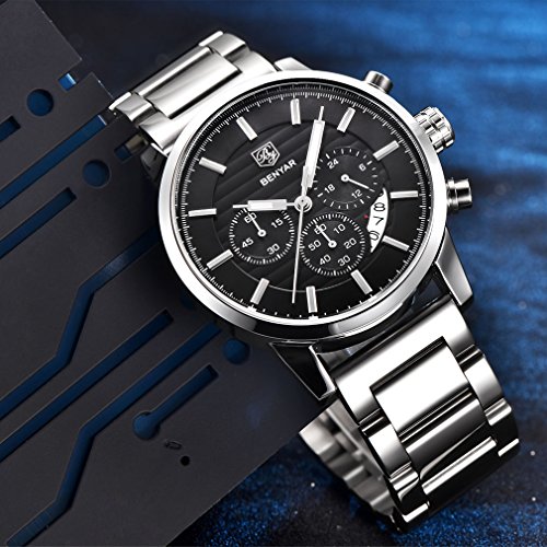 QUALITY STAINLESS STEEL BAND: Scratch Proof Mineral Glass. Stainless Steel Clasp, Easy to put on or take off, bring you comfortable and gentleman wearing experience.