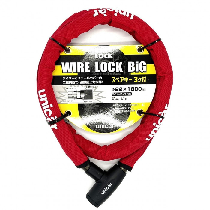 | 1800mmの長さがある本格的なワイヤーロック。色々な用途でお使い頂けます。鍵部分へのイタズラや異物混入を防ぐキャップが付いたタイプ。ワイヤー部分はスチールワイヤーの上に更にスチールカバーを被せた二重構造で、盗難防止力は抜群!! |