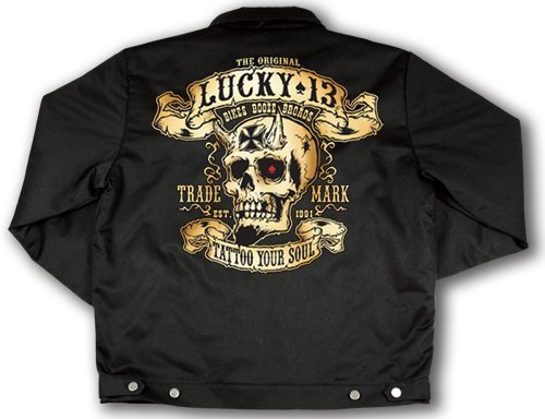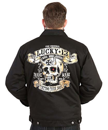 Product DescriptionDevil skull logo embroidered on this quilt lined biker chino jacket by Lucky 130