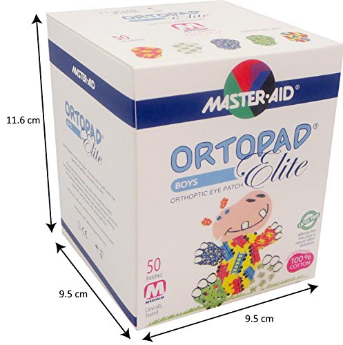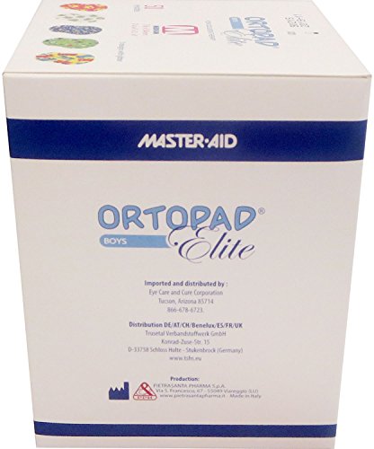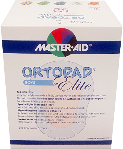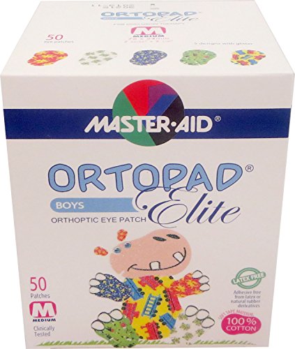 -. Binding : Health and Beauty -. Brand : Ortopad -. EAN : 0360843000231 -. Feature : Hypoallergenic adhesive eye patch that lets the skin breathe / The 5 designs with glitter accents in every box make patching fun / 50 individually fwrapped Medium size (3" x 2-1/8") patches per box or boys 2 to 4 / Special light protection inlay assures maximum shielding from light / Adhesive free from solvents, latex or natural rubber derivatives and preservatives -. IsAdultProduct : 0 -. Label : Pietrasanta Pharma S.p.A. -. Manufacturer : Pietrasanta Pharma S.p.A. -. PackageQuantity : 50 -. ProductGroup : Health and Beauty -. ProductTypeName : HEALTH_PERSONAL_CARE -. Publisher : Pietrasanta Pharma S.p.A. -. Studio : Pietrasanta Pharma S.p.A. -. Title : Ortopad Elite Boys Eye Patches - Patterns with Glitter Accents, Medium Size (50 Per Box) -. UPC : 360843000231