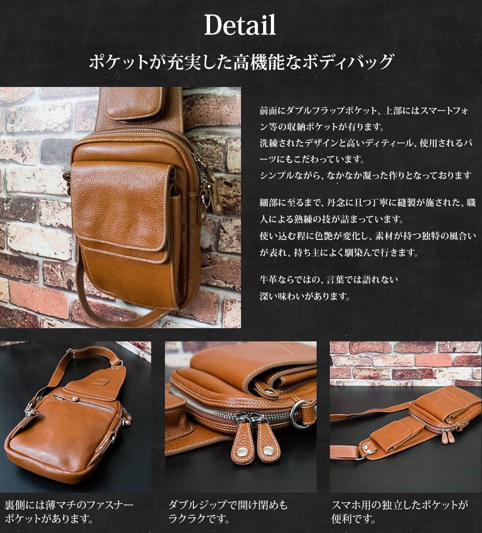 高級皮革のオイルシュリンクレザーを使用した、上質で柔らかく肌触りのよいオイルシュリンクレザーボディバッグ。収納スペースを数多く作られております。ポケットのの上フタの開閉はマグネット方式となっております。2層フラップポケットとスマホ用ポケットが異彩を放つ、大人専用の休日ファッション牛革ボディバッグです。普段持ち歩く財布、スマートフォン、車のキーや手帳等の小物を収納してスタイリッシュに持ち運びできます。ショルダーベルトは長さ調整は可能。またアタッチメントで左右お好みのほうに取り付け可能です。シンプルマインドに可愛さと大人の高級感を表現しており、使い込むほどに深まるレザーの味わいを楽しめます。【サイズ】縦48.0cm(メイン部 18.0cm) × 横18.0cm × マチ4.0cm(本体)縦16.0cm(内寸 13.8cm) × 横18.0cm × マチ4.0cm(スマホケース部)【素材】牛革(本体)合金(金具)【カラー】ブラウン