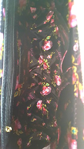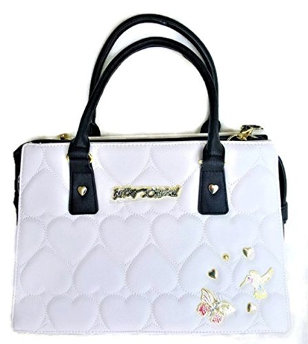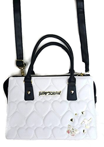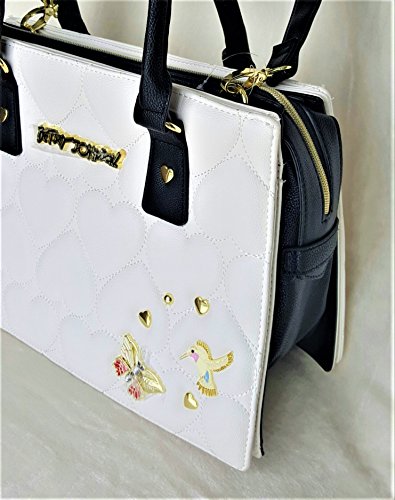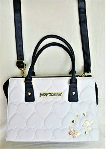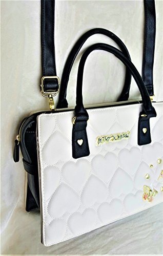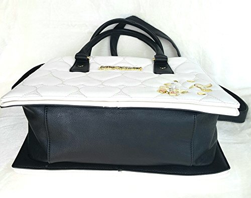 Overall Faux Leather Body. Quilted Hearts Cream color Front & Back panel. Front accented with a Signature logo and gold tone Heart shaped Studs & Decorations. Triple compartment bag: 2 distinct compartments, 1 Center zipper compartment having Side wall zip pocket & 2 tech drop pockets. Dual handles with 6" drop. Removable/adjustable cross body strap with 25" drop approx. Platform bottom. Fully lined in Signature Polyester Floral print. Bag MEASURES: 9.75"(h) x 14"(L) x 5.5"(d)