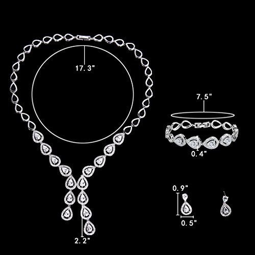 -. Feature : Made of crafted environmental friendly Cubic Zirconias, this jewelry shines with grace and beauty. And the metal surface is of high polished finish. / CZ Color: Clear; Necklace Length: 17.3in, Pendant Size: 2.2in x 4.9in; Bracelet Size: 7.5 inch L x 0.4 inch W; Earrings Size: 0.9 inch L x 0.5 inch W; Total Weight: 32.7g / A ideal accessory to your outfit or as an approP.R.Iate gift, e.g.for your Lover, Girlfriend, Wife, Mother, Daughter, Sister, Fiancee, Couple, Valentine or Best Friend,etc; Suitable for daily wear, ball, party, anniversary, prom, graduation, birthday or any special occasions. / The item in picture with ornament is same as the real object without PS. / Exquisite Gift Wrap: Gift Box + Gift Velvet Bag.