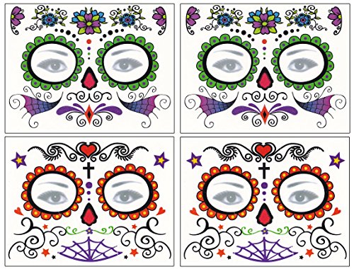 DaLin Floral Day of the Dead Sugar Skull Temporary Face Tattoo Kit for Halloween - Pack of 4 Kits