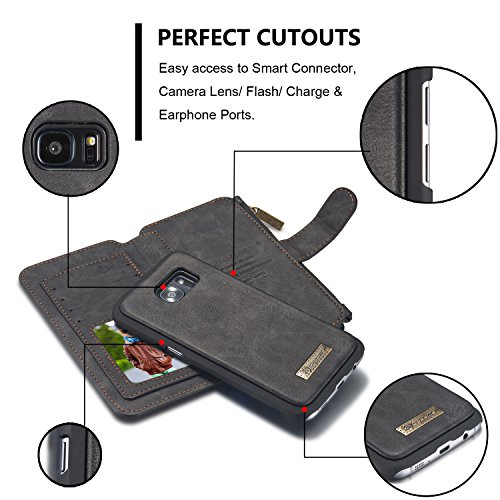 RAYTOP® 15-Slot Card Holders, Samsung Galaxy S7 Edge Case, Inside Cover Removable from Wallet, Button + Zip + Magnet Closure, Multiple Pockets for Money / ID Cards / Driving License, Vintage Black