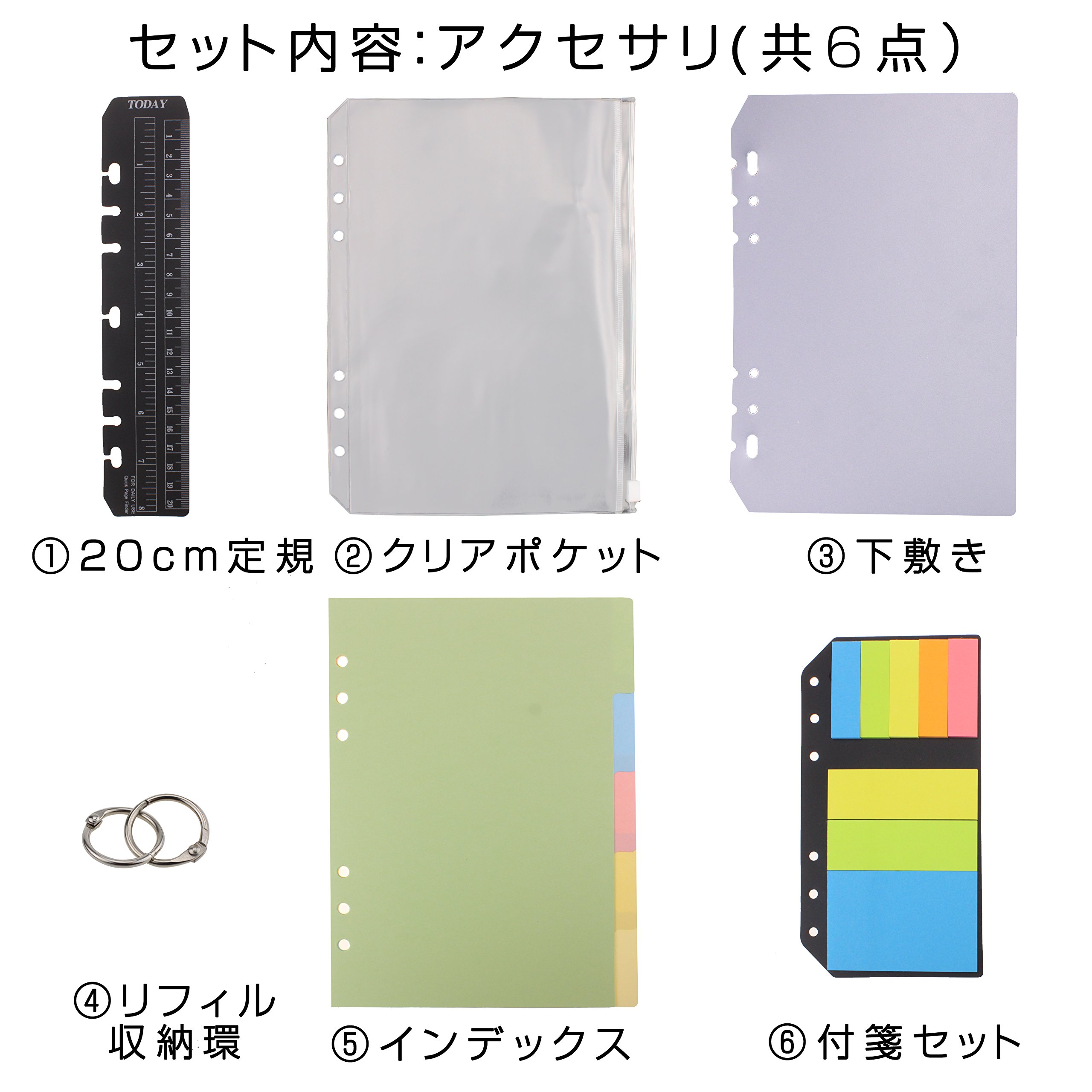 The size is A5, and this product adopts the international standard 6 hole standard for inner diameter 20 mm to expand the refill capacity.