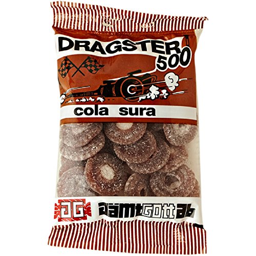 -. Feature : Dragster 500 Cola Sura / Sour cola flavored wine gum / Soft and Chewy, Fat Free candy / Package includes 50 individual 1,76 oz bags / Made in Sweden