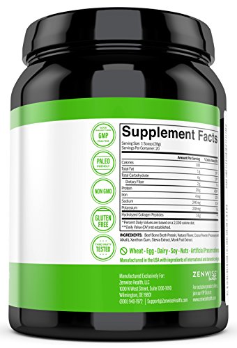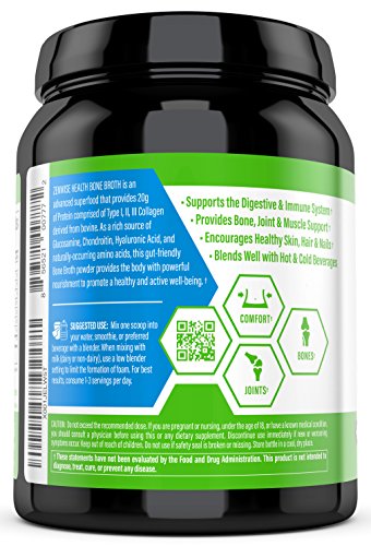 -. Feature : HYDROLYZED PROTEIN POWDER - Zenwise Health Hydrolyzed Protein Bone Broth is a superfood powder with 20g of protein derived from bovine to provide Type I, II, and III Collagen for the joints, immune system, skin, bones, and muscles. / JOINT & MUSCLE SUPPORT - This Bone Broth is a naturally rich source of Glucosamine, Chondroitin, and Hyaluronic Acid. These ingredients support healthy joint flexibility, strength, pain free muscle movement, and healthy joint tissue. / IMPROVES DIGESTIVE FUNCTION - Bone Broth blends easily with water and shakes (dairy or non-dairy) for a great-tasting way to enhance your gut health. The amino acids in this supplement are great for leaky gut and digestive discomfort. / SUPPORTS THE IMMUNE SYSTEM - As Bone Broth supplements the digestive system by healing the lining of the GI tract, the Collagen and amino acids found in this formula also encourage proper immune function to keep you feeling your best. / FOR GREAT LOOKING SKIN & HAIR - With 14g of Collagen Peptides per serving, Bone Broth can help restore elasticity to the skin for a firm and youthful appearance. This formula also contains nutrients that also promote healthy hair growth.