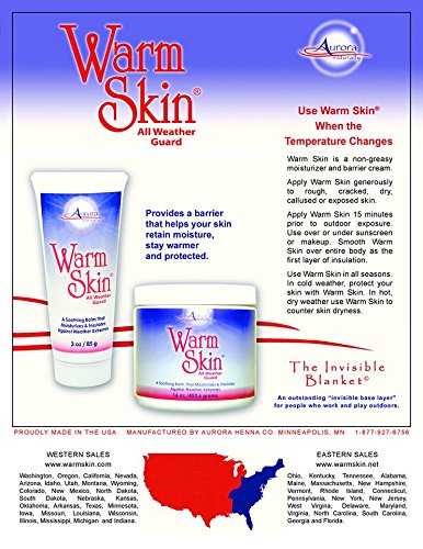 Studio : Aurora Naturally Publisher : Aurora Naturally Binding : Misc. Product Description Warm Skin warms by holding in the body's own natural warmth and serves as a barrier to prevent water loss. It also moisturizes the skin to keep it pain-free and flexible even in the harshest environments. Apply to skin 5-15 minutes prior to outdoor exposure to hold in own body's warmth. Apply another layer of Warm Skin, under clothing and on exposed skin for an Invisible Blanket effect. Works up to 5 hours without re-application. Ingrediants: Water, Aloe Barbadensis Leaf Jusice, Stearic Acid, Glycerin, Isopropyl Palmitate, Acetylated Lanoloin, Isopropyl Lanolate, Methyl Glucose Ether, Santalum Album Extract, Phrllodendron Amurense Bark Extract, Hordeum Distichon Extract, Cetearyl Alcohol, Punica Granatum (Pomegranite) Sterols, Vaccinium Macrocarpon (Cranberry) Seed Oil, Phenoxyethanol, Caprylyl Glycol 0