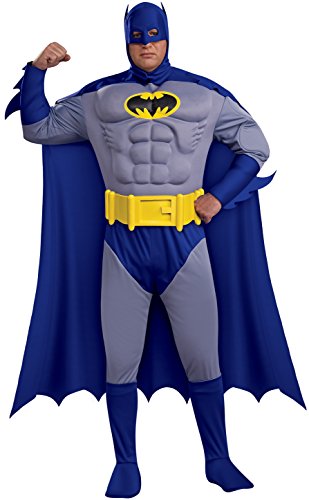 -. Binding : Apparel -. Brand : Rubie's -. ClothingSize : X-Large -. Color : Multi -. Department : mens -. Feature : Muscle chest jumpsuit with attached boot tops, headpiece, cape, and belt / Features Rubie's patented muscle chest for a cut, heroic look / Men's plus size designed to fit jacket size 46 to 52 / Officially licensed The Bold and The Brave costume, buy with confidence direct from Amazon, a trademark of DC Comics / Rubie's offers licensed DC Comics character costumes and accessories in sizes and styles for the entire family -. Genre : Superheroes/Villains -. IsAdultProduct : 0 -. Label : Rubies Costumes - Apparel -. Manufacturer : Rubies Costumes - Apparel -. MPN : 17596 -. PackageQuantity : 1 -. PartNumber : 17596 -. ProductGroup : Apparel -. ProductTypeName : ADULT_COSTUME -. Publisher : Rubies Costumes - Apparel -. Size : X-Large -. Studio : Rubies Costumes - Apparel -. Title : Batman Brave & Bold Deluxe Muscle Chest Adult Plus Costume