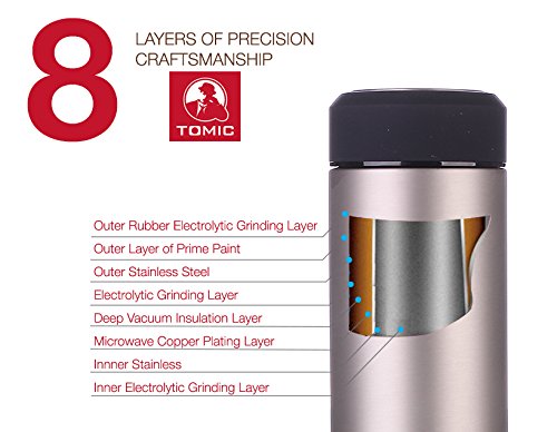 Tomic's 16 ounce Double Wall Vacuum Insulated Stainless Steel Travel Mug/Tumbler with Removable Tea Strainer is the perfect vessel to hold hot drinks and cold drinks. Before, you steeped your tea and then poured the finished product into mugs. Now, you can use the removable tea strainer to steep your tea on your way to work, thus reducing your morning prep time. This travel mug/tumbler is designed with double wall, vacuum insulation for maximum temperature retention-keeping your hot drinks hot and cold drinks cold for longer. Similar to thermos, flasks, and beverage coolers, our double wall vacuum insulation ensures that the surface of the tumbler remains at room temperature. Never will a drink be too hot or cold to hold.