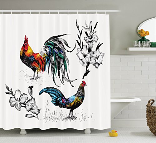 Ambesonne Gallos Decor Collection, Roosters and Flowers Branches Stems Blooms Grasses Wildflowers Artwork Print, Polyester Fabric Bathroom Shower Curtain, 75 Inches Long, Yellow Teal Blue