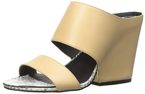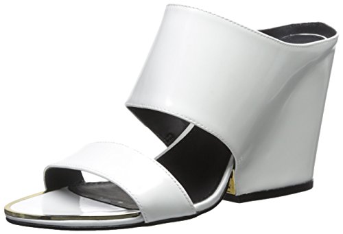 Classic silhouette gets a funky twist with a covered thick wedge heel and metal toe frame detail.