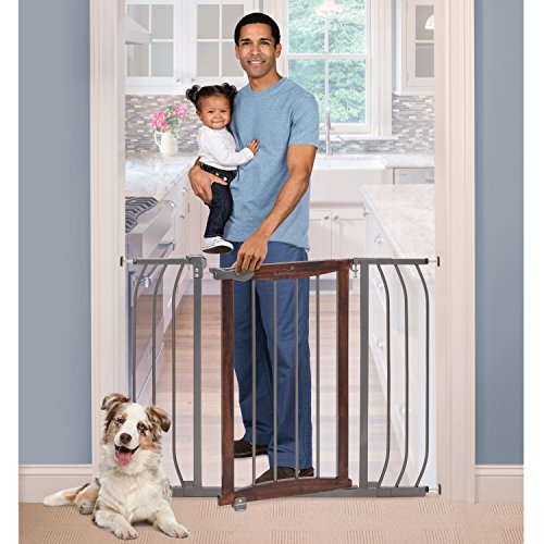 -. Feature : Pressure mounted installation for between rooms with hardware included for top of stair use / Accommodates openings 28" to 42.5" wide; stands tall at 30" / Comfort grip handle with dual locking operation; can be opened and closed with one hand / Versatile, provides a secure barrier for pets / Walnut wood and charcoal accent finish blends with any home decor