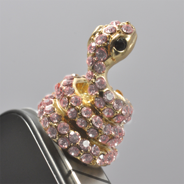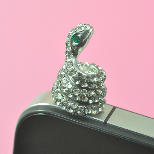 ラインスーンのついたへび型スマートフォン用ピアス! ブラック、ピンクゴールドの2色展開。 イヤホンジャックに装着するだけでスマートフォンを簡単にドレスアップできます! | |