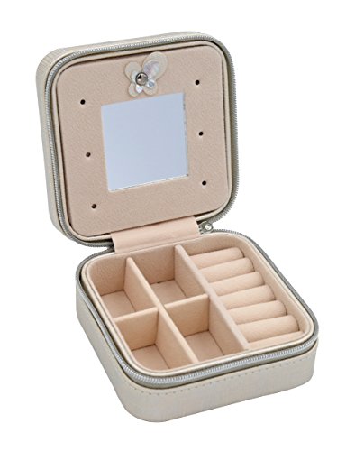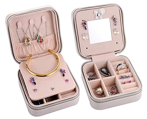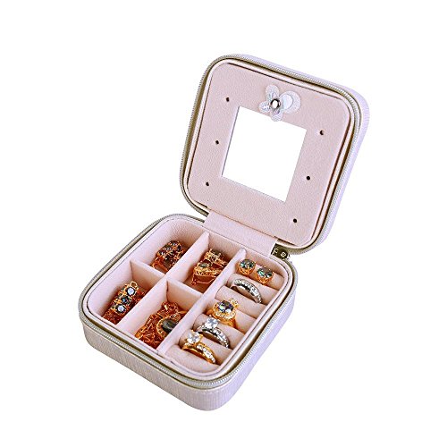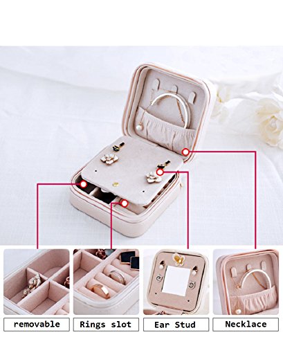 This Mirror in the lid for easy makeup. 4 parts for rings, earrings, necklace and other small jewelries storage. Two removable dividers to meet different needs.Lid and base are solid, well-constructed and sturdy, Keep all your beloved jewelry well organized., raw of ring rolls and a elastic wall pocket; suitable for holding earrings, rings, necklace, etc