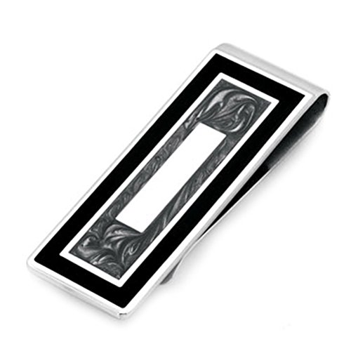 -. Feature : Stainless steel construction / The center of this silver money clip is surrounded with a swirling metallic grey border, smooth silver, and deep black