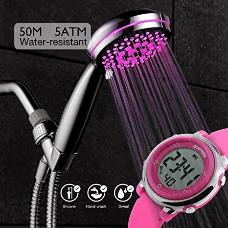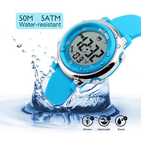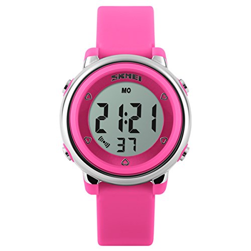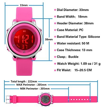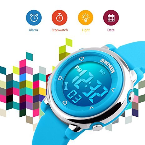 -. Feature : SEVEN BACKLIGHT COLORS: Use imported LED Colorful LED lights, just press the backlight button on the left, girls can clearly see the time of the watches at night. dark blue, green, red, sky blue, orange, pink, purple, these seven backlight colors can be adjusted when children hold down the upper-left backlight button for two seconds, this can satisfy the child's curiosity. / WATERPROOF FOR DAILY USE: 50M Water Resistant, HANDWASH, SWIMMING, NO PROBLEM ! Feel free to wear the stopwatches when girls are showering, swimming and diving. NOTE: Please DO NOT press any buttons in the water or wear this watch for longtime underwater activities - such as diving, ect. Too much water contact or usage in extreme Hot or Cold temperature will shorter watch life. / Digital WATCH: Fashionable dial design for chirlden, sport style outlook. Large Dial and numbers with light, show time clear in the dark. Use import EL Lamp, Press "LIGHT" button to see the time clearly in the light. / SHOCK RESISTANT: The excellent PC material case and Stainless Steel case back which enable the watch to be tough and durable. / COMFORT: High quality silicone strap, plus spray handle oil, the strap is soft and comfortable and environmental friendly.