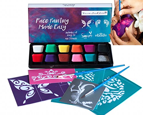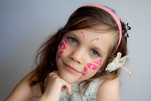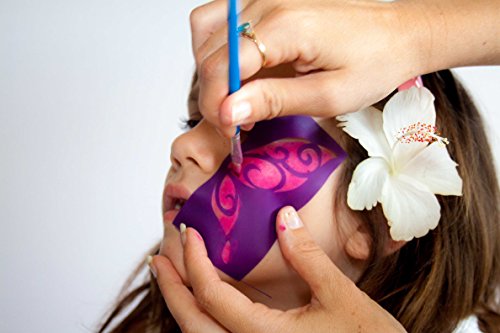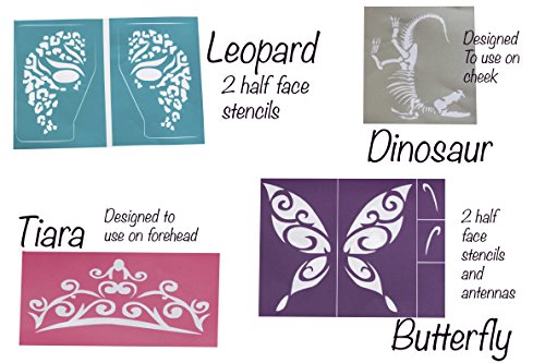 So we all want professional looking face paint designs for our party/event. But finding someone with artistic skills isn't always so easy. So Willow the Pixie Creations has designed an easy to use facepaint kit with a fantastic stencil pack consisting of a tiara, butterfly, leopard and dinosaur. Simply stir a little water into your paint with your paintbrush to your desired consistency and use the stencil to either paint or sponge requested colour to the skin, add glitter if requested and you're done, nice, easy and speedy! ( and you won't end up on a nailed it pinterest page ) Otherwise use your imagination to create your own fantastic designs. Have Fun ! Non toxic, Paraben free, hypo allergenic , washes off with water.Ingredients: WATER, GLYCERYL STEARATE, PEG-1500, POLYSORBATE 20, DIMETHICONE, PROPYLENE GLYCOL, TALC, CALCIUM CARBONATE, SODIUM STEARATE, RED27 LAKE, RED40LAKE, BLUE 1 LAKE, YELLOW 5LAKE, YELLOW6 LAKE, TITANIUM DIOXIDE, IRON OXIDES.Feature