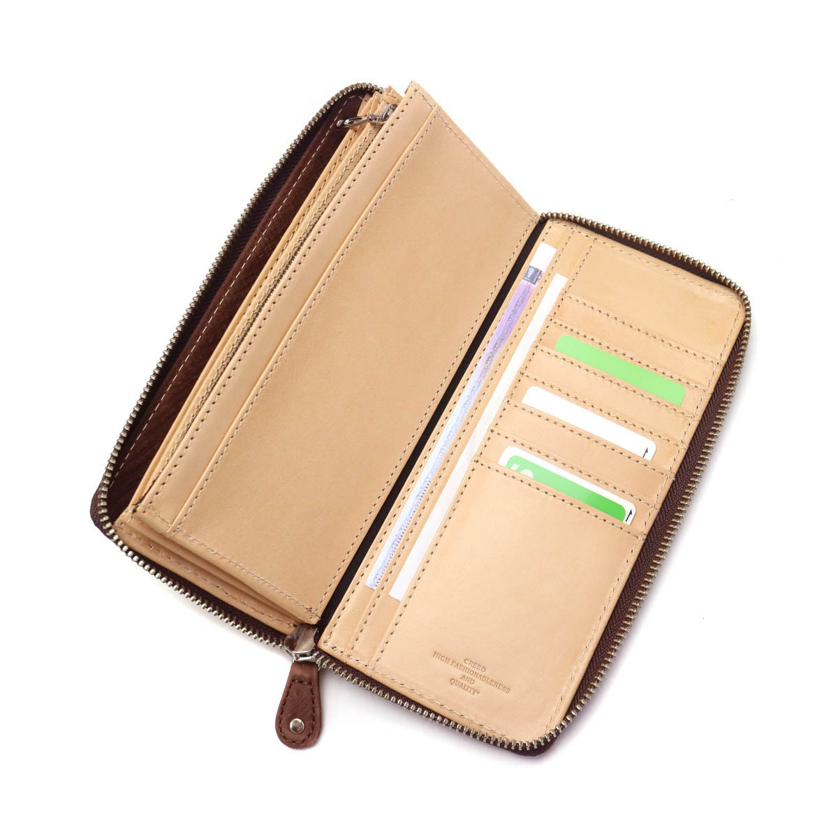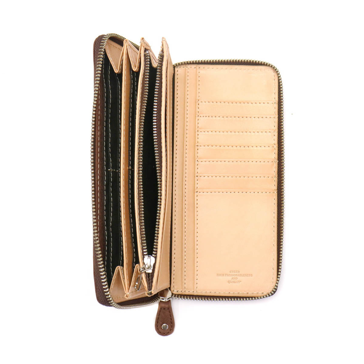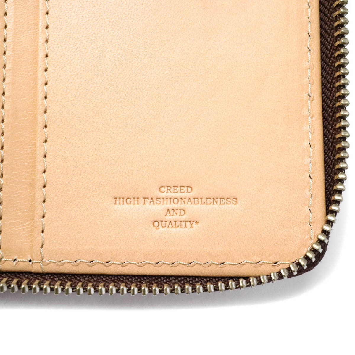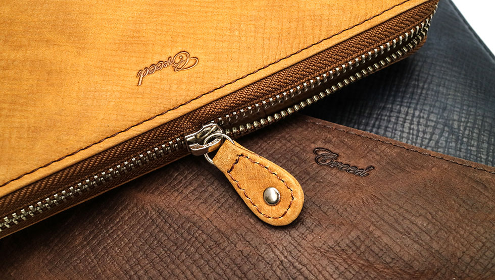 We finish domestic raw skin with dyestuffs and wax, giving it a soft texture and a crisp texture. Every one piece is stamped and smoothed, and finished to a unique texture such as rubbed like Atari. From selection of materials to design Creed richness is condensed, you can use regardless of gender.
