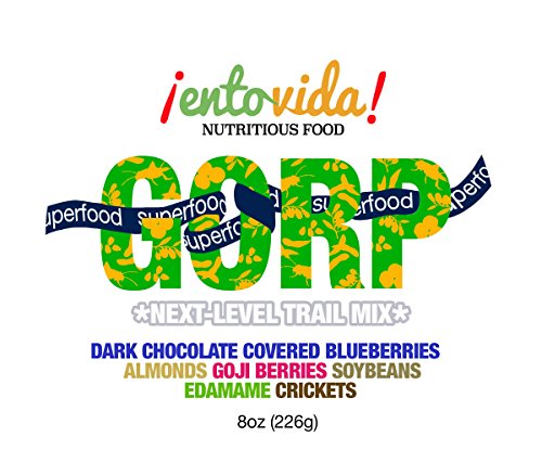 -. Feature : Delicious, nutritious and chock full of protein / This SUPERFOOD GORP has dark chocolate covered blueberries, almonds, goji berries, soybeans, & edamame and whole roasted crickets to top off the superfood ingredient list. / Dive in and experience this next level trail mix with the added protein boost of roasted crickets. / Our crickets are farm-raised for human consumption.